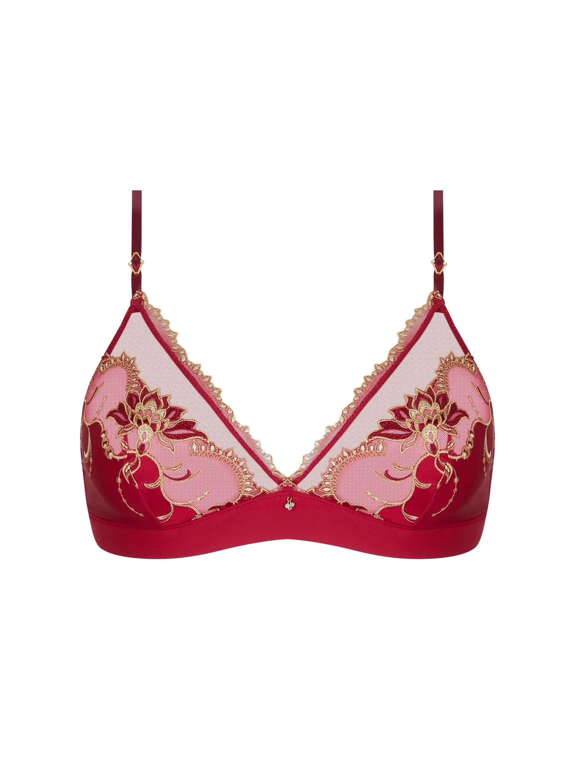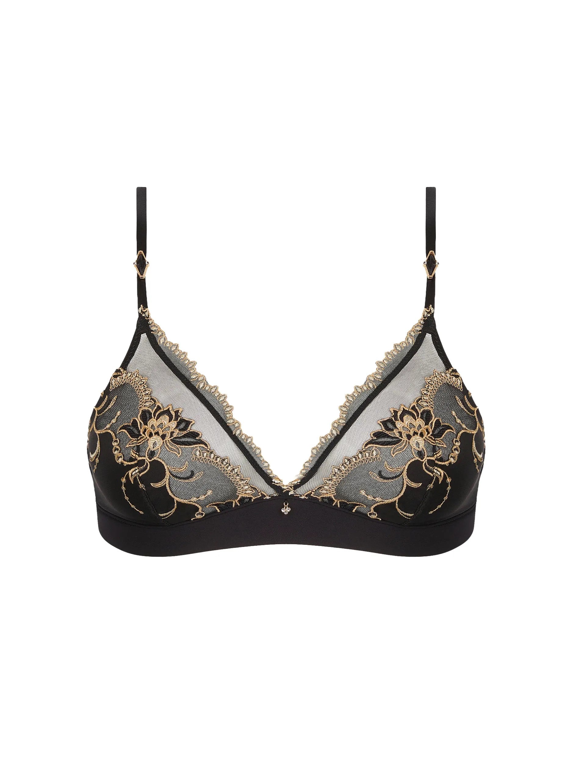 Discover the luxurious Eblouissante Icone Silk Non-Wire Bra from Lise Charmel, featuring stunning embroidery on multi-strand tulle and a delicate scalloped band that accentuates the transparent tulle cleavage. This exquisite collection celebrates nature with sumptuous floral designs, while the cup boasts intricate multi-thread embroidery on tulle and a gilded rhinestone jewel at the cleavage. The silk satin band and straps embellished with a rhinestone jewel add a touch of elegance to this opulent bra.