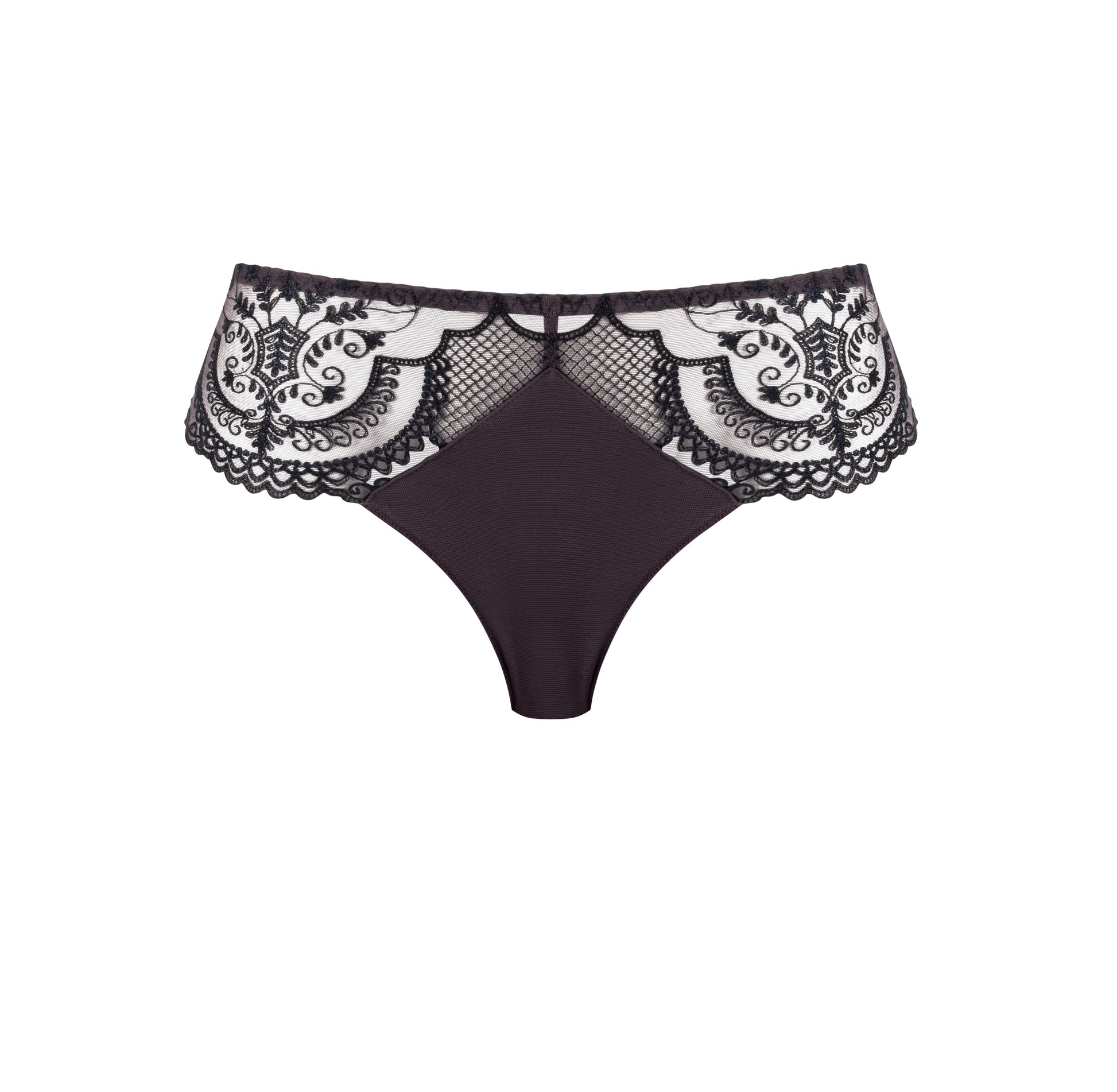 This elegant and intricately embroidered shorty is from the Kant line by Louisa Bracq of France. The design draws inspiration from the refined La Belle Époque embroidery period in French and European history, reimagined in a geometric and symmetrical fashion. The garment features embroidered tulle and opaque microfiber, both boasting a supple and flexible texture.